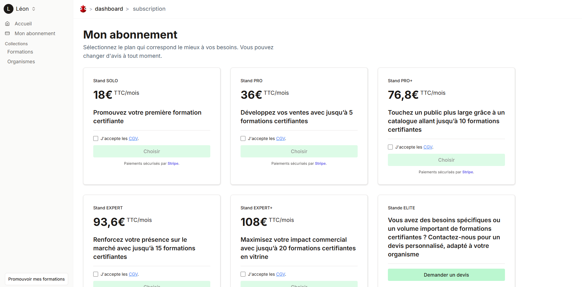 Une fois que vous avez choisi votre plan, vous pouvez promouvoir vos formations sur MesCertifs.fr. Gérez et mettez à jour vos offres automatiquement depuis votre dashboard.